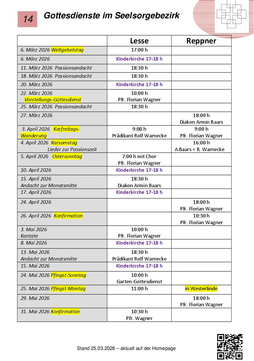 Den Gottesdienstplan unseres Seelsorgebezirkes für März bis Juni können Sie sich hier ansehen und auch herunterladen. Hier finden Sie sowohl die Gottesdienste in Lesse + Reppner.